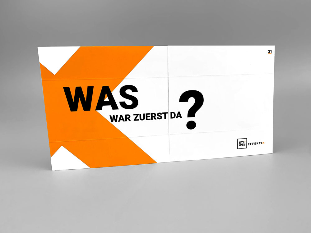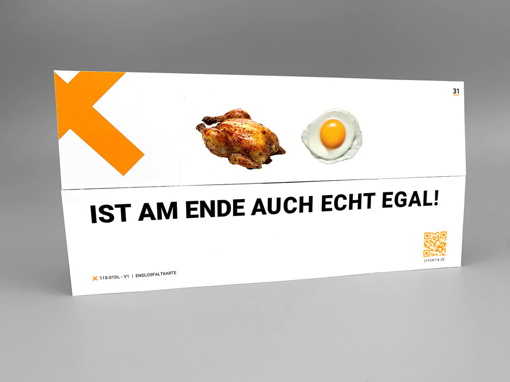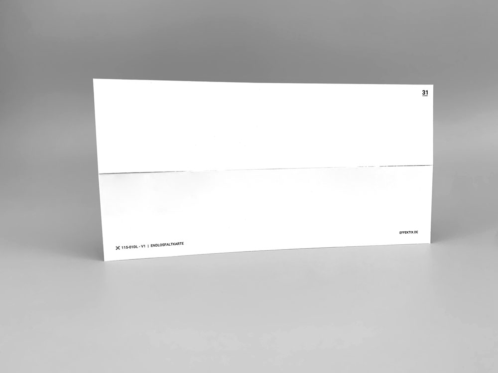 Stell dir vor, du könntest deine Botschaft in einer Endlosschleife präsentieren! Mit unserer Endloskarte ist das jetzt möglich. Bevor man es bemerkt, hat man wieder angefangen, die Karte von vorne zu lesen. Glaubst du nicht? Dieses faszinierende Design kann horizontal aufgeklappt werden, dann vertikal und wieder horizontal... bis du wieder am Anfang bist - aber das ist noch nicht alles. Du kannst einfach weiter klappen und klappen und klappen. Die Möglichkeiten sind praktisch endlos, genau wie die Faszination deiner Empfänger für diese einzigartige Karte. Sie ist perfekt, wenn du nach einem unvergesslichen Einstieg für dein Mailing suchst. Wir garantieren, dass jede Seite dieser Karte mehr als einmal genau inspiziert wird!