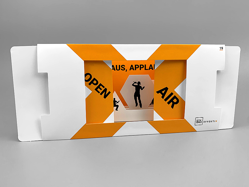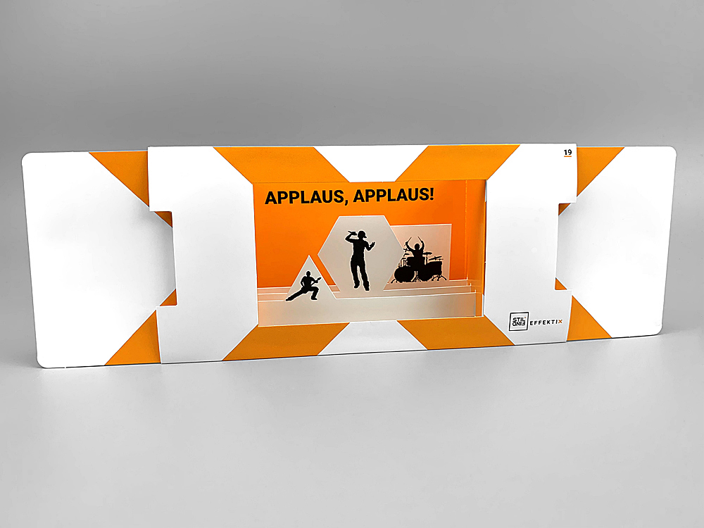 Mit der Bühnenkarte 3D tritt deine Botschaft ins Rampenlicht. Sobald die Karte an den Seiten geöffnet wird, entfaltet sich eine beeindruckende dreidimensionale Bühne, auf der du deine Message perfekt inszenieren kannst. Der geschickte Einsatz von mehreren Ebenen schafft eine Illusion von Tiefe und zieht die Betrachter unweigerlich in das Geschehen auf der Bühne hinein. Diese Karte kann aufgeklappt stehen bleiben, was sie zu einer guten Wahl für jede langfristig wirksame Marketing-Kampagne macht. Denk' nur an die Faszination, die eine Inszenierung auf einer Theater- oder Konzertbühne mit ihrer Tiefe und ihren Ebenen auslöst: Diese Karte bietet genau das in klein und transportabel.