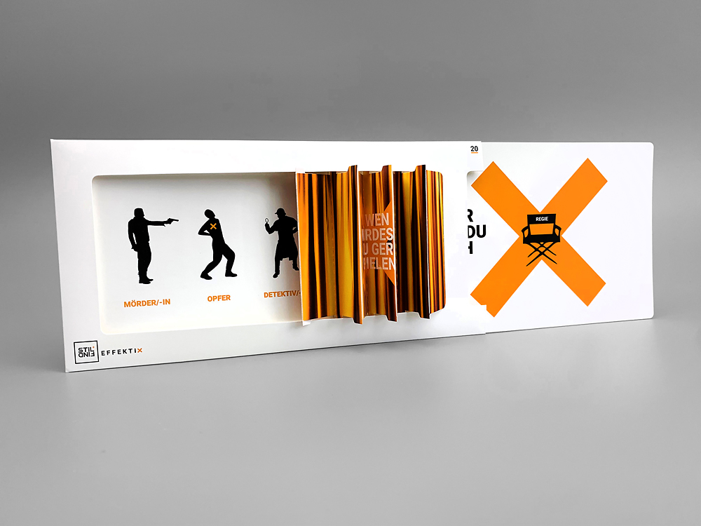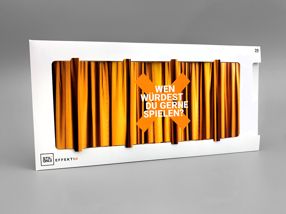 Die Vorhangkarte verwandelt jede Enthüllung in einen dramatischen Moment, zu dem jeder die Luft anhält. Ganz ähnlich einer Premiere im Theater schafft die Jalousiekarte eine Bühne für deine Mailing-Kampagne. Wenn an der Lasche gezogen wird, bewegt sich der Kartonvorhang beiseite und gibt die verborgenen Inhalte dahinter frei. Diese interaktive Bewegung zieht unweigerlich die Aufmerksamkeit auf sich und macht die Vorhangkarte zur idealen Wahl für exklusive Premieren und Produktvorstellungen. Nutze den Überraschungsmoment, um deine Produkte und Dienstleistungen in einem neuen Licht zu präsentieren. Diese interaktive Karte bietet eine spannende Möglichkeit, deine Botschaften zu enthüllen und deine Zielgruppe zu engagieren. So gehen deine Direktmarketing-Maßnahmen ganz sicher glatt über die Bühne.